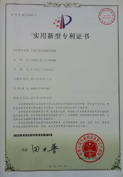 平板車牽引架緩沖機(jī)構(gòu)專利證書